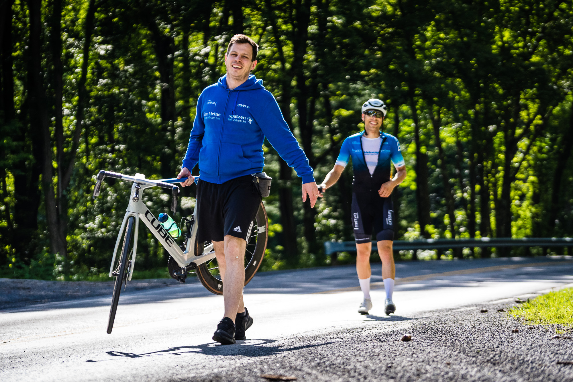 Schichtwechsel! Andy und Consti kehren ein, während Daniel und Achim aufs Rad steigen. Bei 31 Grad Hitze sind Consti und Andy am Ende schwarz gefahren.